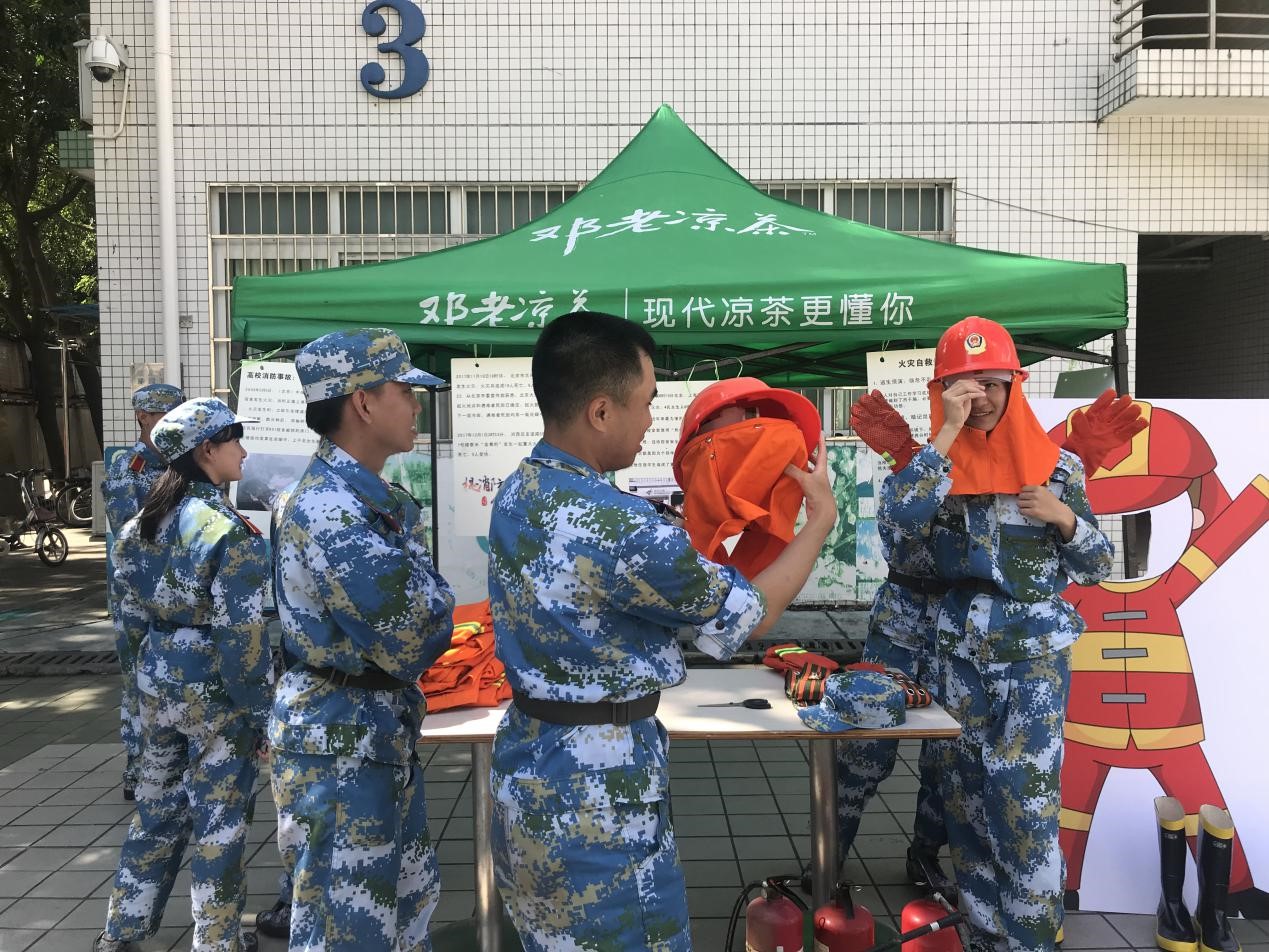 此外,活动还展示了消防帽、消防服和消防靴等实物,同学们踊跃试戴试穿。
